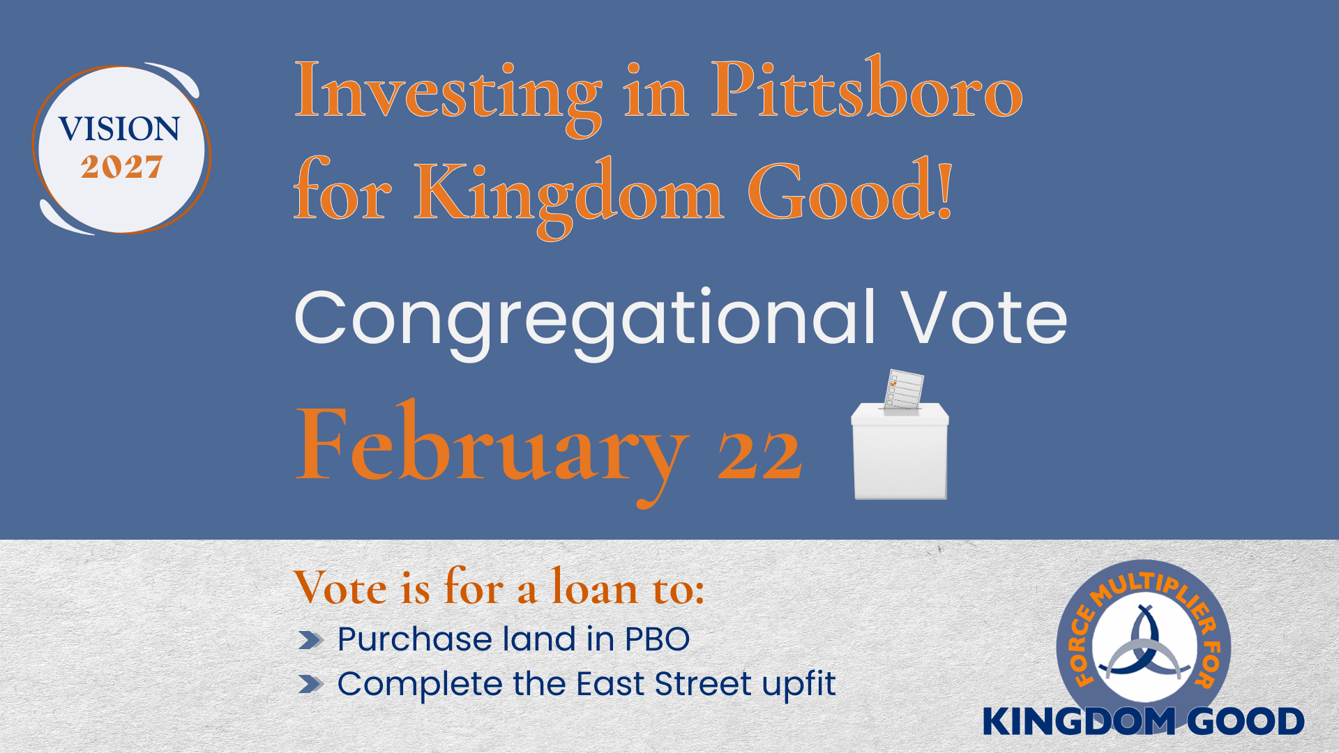 To move forward with the purchase, we are proposing that the church take out a loan. Our constitution requires congregational approval for any debt, so we will hold a Congregational Vote on February 22, 2026.